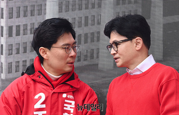 한동훈 국민의힘 총괄선거대책위원장과 조정훈 마포갑 후보가 28일 오전 서울 마포구 망원역 앞에서 열린 선거유세 현장에서 대화를 하고 있다.