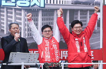 공식 선거운동이 시작된 28일 오전 한동훈 국민의힘 총괄선대위원장과 조정훈 마포갑 후보가 함운경 마포을 후보의 연설을 들으며 어깨동무 하고 있다.