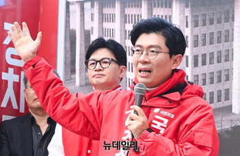 조정훈 국민의힘 마포갑 후보가 28일 오전 서울 마포구 망원역 앞에서 열린 함운경 마포을 후보 선거유세 현장에서 지지를 호소하고 있다.