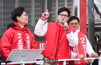한동훈 국민의힘 총괄선대위원장이 28일 오전 서울 마포구 망원역 앞에서 열린 함운경 마포을 후보 선거유세 현장에서 지지를 호소하고 있다.