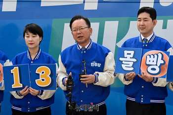 김부겸 더불어민주당 상임공동선대위원장 및 당 관계자들이 27일 국회 본청 앞에서 '더 몰빵13 유세단' 출정식을 하고 있다.