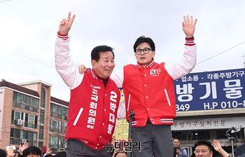 김기현 국민의힘 울산남구을 후보가 26일 오후 울산 북구 호계시장를 찾은 한동훈 비상대책위원장과 지지자들에게 인사를 하고 있다. (울산=서성진 기자)