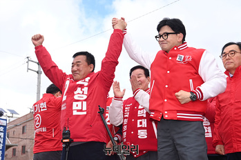 한동훈 국민의힘 비상대책위원장이 26일 오후 울산 북구 호계시장에서 열린 거리인사에서 박성민 울산중구 후보와 손을 잡고 인사를 하고 있다. (울산=서성진 기자)