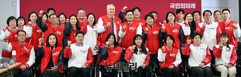 인요한 국민의미래 선거대책위원장 등 비례대표들이 26일 오전 서울 여의도 당사에서 열린 선거대책위원회 회의에서 기념촬영을 하고 있다.