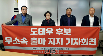 자유우파 시민단체 회원들이 25일 오후 서울 종로구 종로빌딩에서 22대 총선 대구 중·남구에 무소속으로 출마하는 도태우 후보를 지지하는 기자회견을 갖고 있다. 이들은 "지난 8년동안 지켜본 도태우 후보는 투철한 국가관과 성실함, 신뢰의 상징적 인물임에 이견이