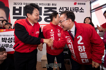원희룡 계양을 후보와 하종대 부천병 후보가 23일 오후 경기 부천에서 열린 박성중 후보 선거사무소 개소식에서 악수를 나누고 있다. (경기 부천=서성진 기자)