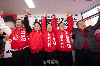 김복덕 부천갑 후보(왼쪽부터), 원희룡 계양을 후보, 박성중 부천을 후보, 하종대 부천병 후보, 윤재옥 원내대표가 23일 오후 경기 부천에서 열린 박성중 후보 선거사무소 개소식에서 기념촬영을 하고 있다. (경기 부천=서성진 기자)