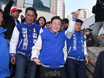 이재명 더불어민주당 상임공동선대위원장이 23일 오후 경기 김포 라베니체에비뉴에서 김주영 김포갑 후보, 박상혁 김포을 후보와 함께 시민들에게 인사하고 있다. (경기 김포=서성진 기자)