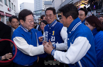 이재명 더불어민주당 상임공동선대위원장이 23일 오후 경기 김포 라베니체에비뉴에서 김주영 김포갑 후보, 박상혁 김포을 후보와 인사하고 있다. (경기 김포=서성진 기자)