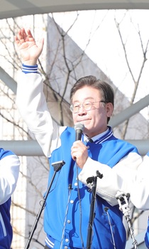 이재명 더불어민주당 대표겸 상임공동선대위원장이 22일 오전 충남 서산시 동부시장에서 조한기 서산 태안 후보와 함께 시민들에게 인사하고 있다. (충남 태안=서성진 기자)