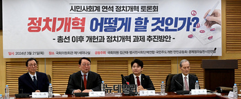 '정치개혁 어떻게 할 것인가?' 토론회가 21일 오전 국회 의원회관에서 김근태 국민의미래 의원, 범시민사회단체연합(범사련), 국민주도개헌 만민공동회 경제정의실천시민연합(경실련) 주최로 열리고 있다.이날 토론회는 4.10 총선을 앞두고 보수, 진보, 중도를 아우르는 범시