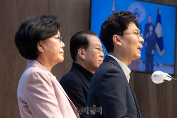 조정훈 국민의힘 마포갑 후보, 권영세 용산구 후보, 이혜훈 중구성동구을 후보가 21일 오후 국회 소통관 기자회견장에서 만리재역 신설 관련 합동 기자회견을 하고 있다.