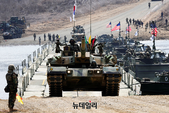 대한민국 육군 K1E1 전차가 20일 오전 경기 연천군 임진강 일대에서 진행된 한미연합 제병협동 도하훈련에서 부교를 건너고 있다.이날 훈련은 한미연합 공병정찰을 시작으로 항공수송을 통한 연합부교 구축, 기동부대 부교 도하 순으로 진행됐다.훈련에는 5공병여단을 포함해 5