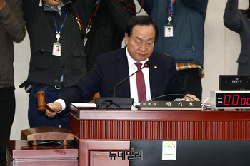 한기호 국방위원장이 15일 오전 국회에서 열린 국방위원회 전체회의에서 의사봉을 두드리고 있다.