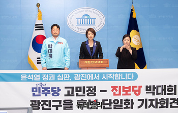 고민정 더불어민주당 의원과 박대희 진보당 광진을 예비후보가 14일 오후 국회 소통관에서 단일화 기자회견을 하고 있다.