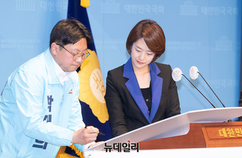 고민정 더불어민주당 의원과 박대희 진보당 광진을 예비후보가 14일 오후 국회 소통관에서 단일화 기자회견에서 합의문을 작성하고 있다.