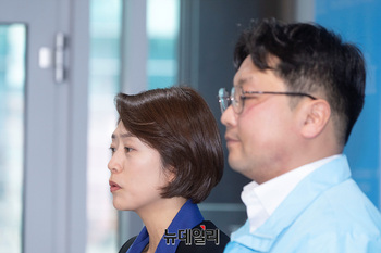 고민정 더불어민주당 의원과 박대희 진보당 광진을 예비후보가 14일 오후 국회 소통관에서 단일화 기자회견을 마치고 취재진의 질문에 답하고 있다.