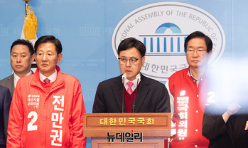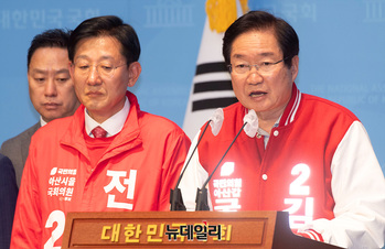 이명수 국민의힘 의원이 14일 오후 국회 소통관에서 아산갑을 김영석, 전만권 예비후보를 소개하고 있다.