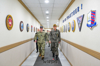 최성혁(중장) 해군작전사령관(연합해군구성군부사령관)과 프레드 케이처(중장) 미 해군 7함대사령관(연합해군구성군사령관)이 13일 연합해군구성군사령부 '자유의방패'(FS) 연습에 대해 논의하며 해군작전사령부 작전지휘소를 걷고 있다. 이날 한미 해군 지휘관들은 연합