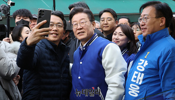 이재명 더불어민주당 대표가 13일 오후 서울 용산구 용문전통시장에서 시민과 기념촬영을 하고 있다.