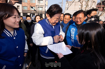 이재명 더불어민주당 대표가 13일 오후 서울 용산구 용문전통시장에서 지지자에게 싸인을 해주고 있다.