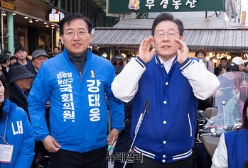 이재명 더불어민주당 대표가 13일 오후 서울 용산구 용문전통시장에서 강태웅 용산구 예비후보와 함께 지지호소를 하고 있다.