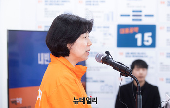 양정숙 개혁신당 의원이 13일 오전 경기 용인시 양향자 용인갑 예비후보 선거사무소에서 열린 개소식에서 축사를 하고 있다. (경기 용인=서성진 기자)