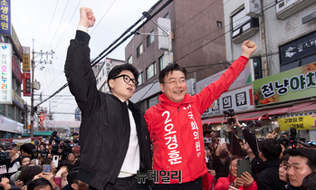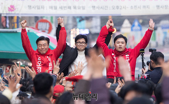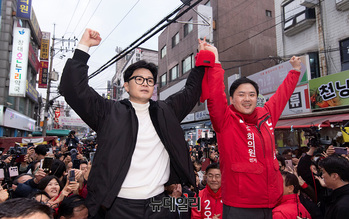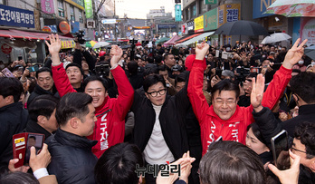 한동훈 국민의힘 비상대책위원장이 12일 오후 서울 양천구 목동깨비시장에서 양천갑을 구자룡, 오경훈 예비후보의 손을 잡고 시민들에게 인사하고 있다.