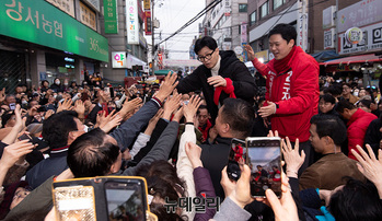 한동훈 국민의힘 비상대책위원장이 12일 오후 서울 양천구 목동깨비시장에서 오경훈 양천을 예비후보와 함께 시민들에게 인사하고 있다.