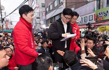 한동훈 국민의힘 비상대책위원장이 12일 오후 서울 양천구 목동깨비시장에서 양천갑을 구자룡, 오경훈 예비후보와 함께 시민들에게 인사하고 있다.