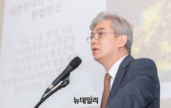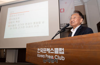유일호 안민정책포럼 이사장이 12일 오전 서울 중구 프레스센터에서 열린 '국가전략 씽크탱크 대토론회'에서 기조연설을 하고 있다.이날 토론회는 유일호 안민정책포럼 이사장이 기조연설을, 박명호 안민정책포럼 회장과 황승연 굿소사이어티조사연구소 대표가 발표를 맡았다.이어진 토