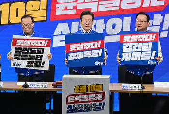 더불어민주당 상임공동선대위원장을 맡은 이재명대표, 이해찬 전 대표, 김부겸 전 국무총리가 12일 오전 서울 영등포구 여의도 중앙당사에서 열린 선거대책위원회 출범식에서 피켓을 들고 있다.