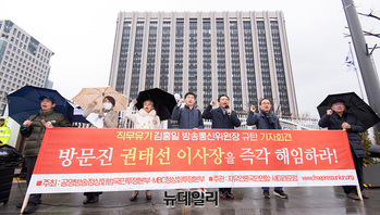 공영방송정상화범국민투쟁본부(상임공동본부장 이준용·이철영)가 12일 오전 서울 종로구 정부서울청사 앞에서 '김홍일 방송통신위원장 규탄' 기자회견을 열고, 권태선 방송문화진흥회 이사장 해임을 촉구하는 구호를 외치고 있다. 이날 투쟁본부는 "김홍일 방통위원장이 MB