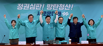 이낙연 새로운미래 공동대표와 김종민 상임선대위원장, 홍영표 공동선대위원장 등 참석자들이 11일 오전 국회 의원회관에서 열린 선거대책위원회 출범식에서 기념촬영을 하고 있다.