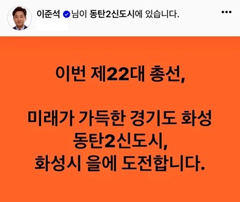 이준석 개혁신당 대표가 2일 경기 화성을에 출마하겠다고 밝혔다.이 대표는 이날 오후 자신의 SNS에 "이번 제22대 총선, 미래가 가득한 경기도 화성 동탄2신도시, 화성시 을에 도전한다"고 적었다.지난달 27일 경기도의회에서 '경기남부 첨단벨트 총선 전략'을 발표하며