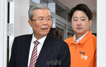 이준석 개혁신당 대표와 김종인 공천관리위원장이 26일 국회에서 열린 최고위원회의에 참석히기 위해 입장하고 있다.