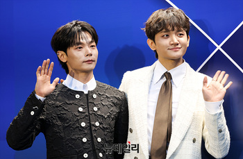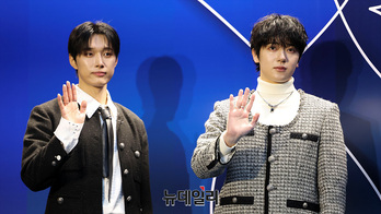 그룹 오메가엑스 재한과 예찬이 3일 오후 서울 중구 동대문디자인플라자에서 열린 '서울패션위크 2026 FW' 포토월에서 포즈를 취하고 있다.