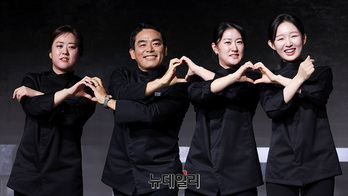 술빚는 유주모, 프렌치 파파, 중식마녀, 아기 맹수가 17일 오전 서울 종로구 JW메리어트동대문스퀘어에서 열린 넷플릭스 예능 '흑백요리사: 요리 계급 전쟁2' 제작발표회에서 포즈를 취하고 있다.'흑백요리사2'는 오직 맛으로 계급을 뒤집으려는 재야의 고수 '흑수저' 셰프