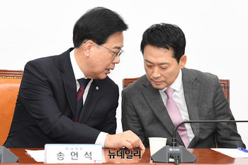 장동혁 국민의힘 대표가 9일 오전 국회에서 열린 최고위원회의에서 송언석 원내대표와 대화를 나누고 있다.