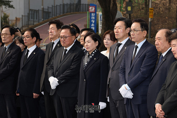 서명옥(강남갑), 박수민(강남을), 고동진(강남병) 국민의힘 의원, 조성명 강남구청장 등 시구의회의원들이 27일 오전 서울 강남구 수도전기공고에서 열린 제16주기 고 한주호 준위 추모식에 참석해 자리하고 있다. 추모식 직후 제11회 서해수호의날 기념식이 이어졌다.&nb