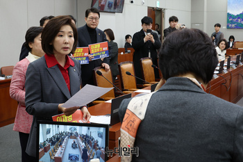 나경원·송석준·신동욱·윤상현 국민의힘 의원 등이 20일 오전 국회에서 열린 '윤석열정권정치검찰조작기소의혹사건 진상규명국정조사특별위원회'에서 서영교 위원장에게 일방적 국조특위 구성을 항의하고 있다.