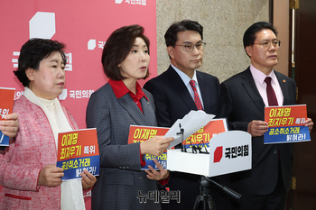 나경원 국민의힘 의원 및 법사위 의원들이 20일 오전 국회에서 민주당, 조국혁신당, 진보당 중심의 '윤석열정권정치검찰조작기소의혹사건 진상규명국정조사특별위원회' 구성에 항의하는 기자회견을 하고 있다.