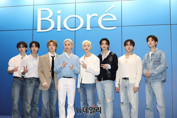그룹 스트레이 키즈(리노, 한, 아이엔, 필릭스, 방찬, 현진, 창빈, 승민)가 19일 오후 서울 성동구 성수 차량팝업존에서 열린 일본 뷰티 브랜드 '비오레(Biore)' 글로벌 킥오프 이벤트에서 포즈를 취하고 있다.