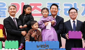 오세훈 서울시장을 비롯한 참석자들이 12일 오후 서울 강서구 서울키즈플라자 개관식에서 기념촬영을 하고 있다.