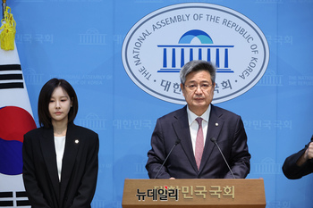 김장겸 국민의힘 의원과 유튜버 쯔양 변호인 김태연 변호사가 18일 국회 소통관에서 구제역 재판소원 관련 기자회견을 하고 있다.