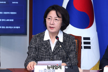 추미애 국회 법제사법위원장이 17일 국회에서 열린 더불어민주당 검찰개혁 관련 긴급 기자회견에서 발언을 하고 있다.