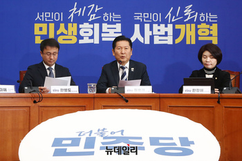 정청래 더불어민주당 대표가 17일 오전 국회에서 검찰개혁 관련 긴급 기자회견을 갖고 발언을 하고 있다. 이날 정 대표는 중대범죄수사청·공소청을 신설하는 검찰개혁 법안과 관련해 "국민들께서 걱정하시던 공소청 검사의 수사 지휘 및 수사 개입 여지와 관련한 여러 조
