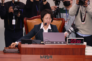추미애 법사위원장이 16일 오후 국회에서 열린 법제사법위원회 전체회의에서 정회를 선포하고 있다.