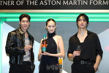 셰프 오스틴 강(왼쪽부터), 모델 신현지, 채종석이 22일 오전 서울 여의도 더현대 서울에서 열린 ‘글렌피딕 16년 한정판’ 팝업스토어 오픈 기념행사에서 포즈를 취하고 있다.