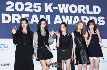그룹 하츠투하츠가 21일 오후 서울 송파구 잠실 실내체육관에서 열린 '2025 케이 월드 드림 어워즈( K-WORLD DREAM AWARDS 2025)' 블루카펫에서 포즈를 취하고 있다.